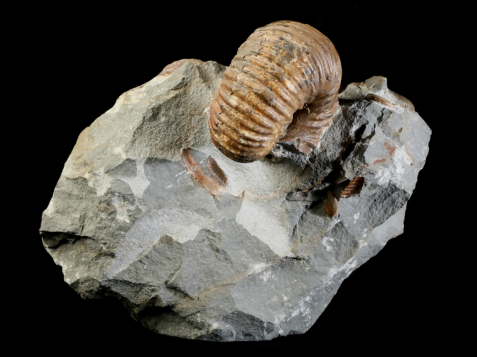 Natural pyritized ammonites were mounted together on small fragment of the argyllite septaria with pyrite.